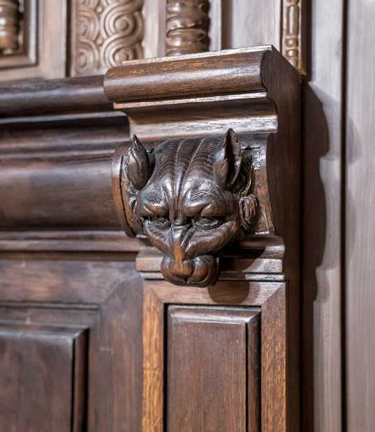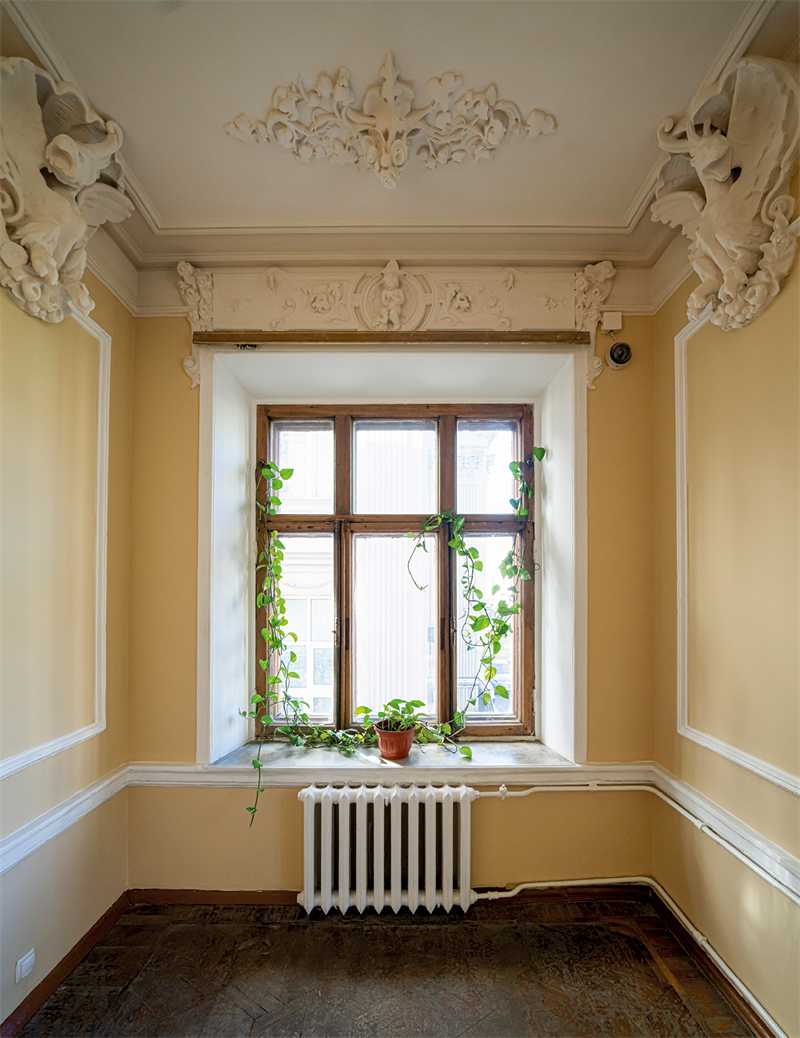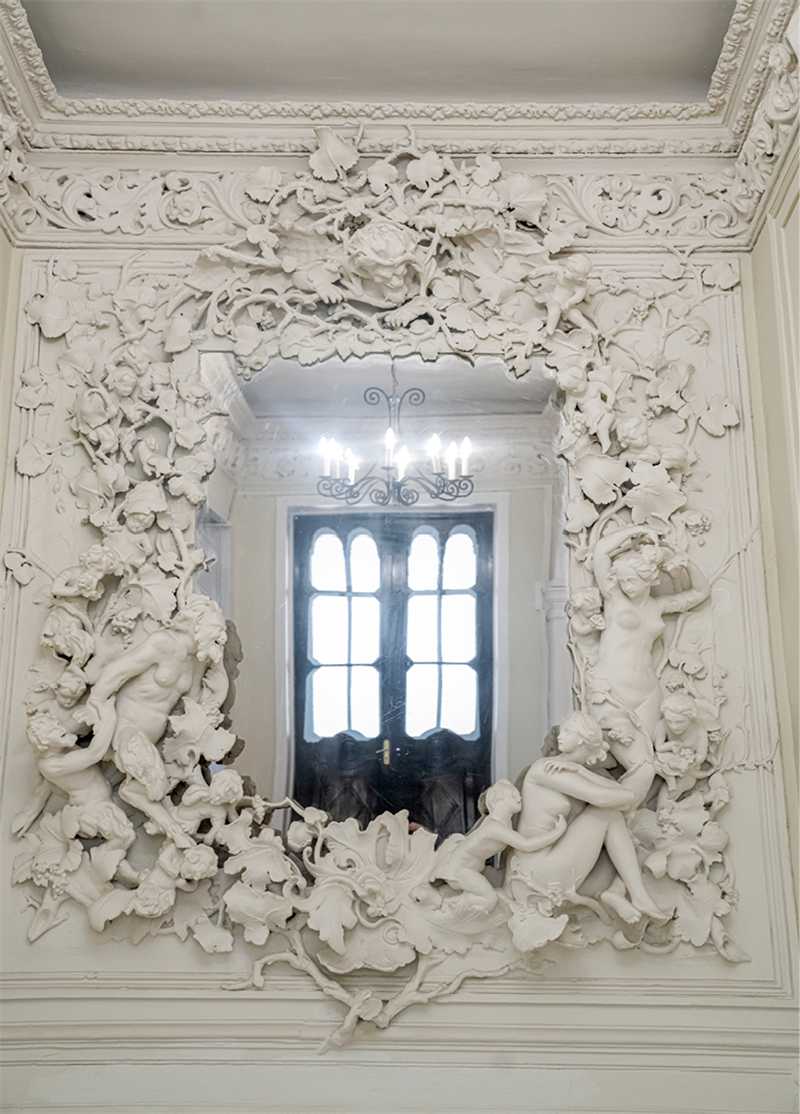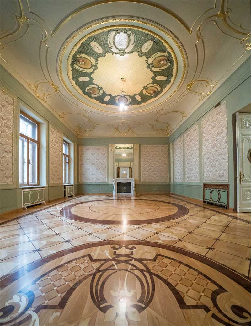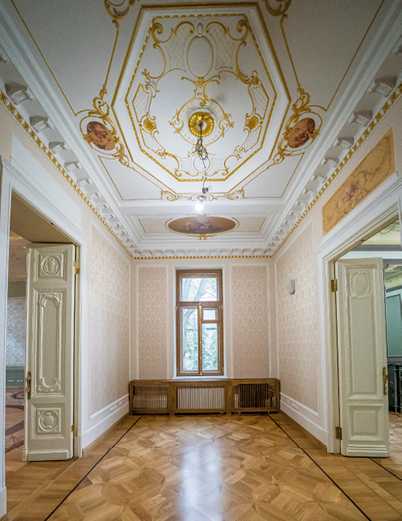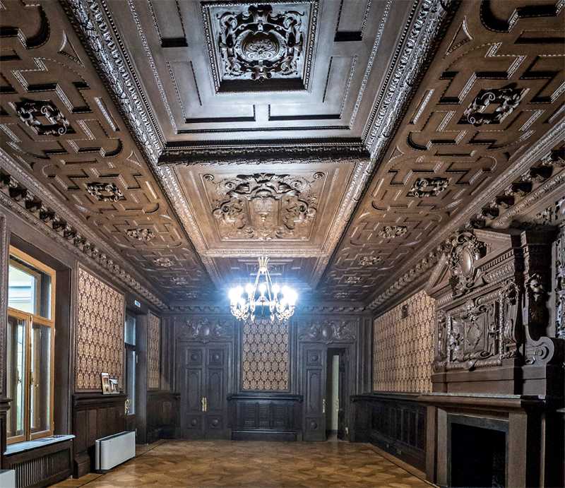 На фасаде особняка мы видим маскарон веселого бородатого античного божества, которого за усы тянут младенцы путти, а над парадным входом – грифонов, символов силы и хранителей семейной тайны. Интерьеры выполнены в разных стилях и разными архитекторами. Парадная лестница особняка, скорее всего, сохранилась со времени Каминского, так же как и планировка комнат. На фотографиях вы видите роскошный Белоколонный зал, Греческий зал и Рокайльную гостиную. В ней, единственном помещении во всем особняке, полностью сохранился необыкновенный рисунок паркета. В остальных комнатах паркет был воссоздан во время реставрации по уцелевшим фрагментам. В этой же гостиной сохранился расписной потолочный плафон, а в соседней комнате – роспись по холсту, помещенная в картуш. Роспись во втором картуше была воссоздана. Во время недавней реставрации под картоном и панелями одной из комнат на первом этаже была найдена «деревянная столовая». Никто не знал о ее существовании. Необычна и техника, в которой выполнен зал: дубовые панели дополнены гипсовой имитацией под дерево. Рельефный потолок был расписан альфрейной росписью под дуб. Штоф по стенам выглядит, как гобелены, однако это обычная мешковина, на которую набит рисунок, а затем немного позолочен.