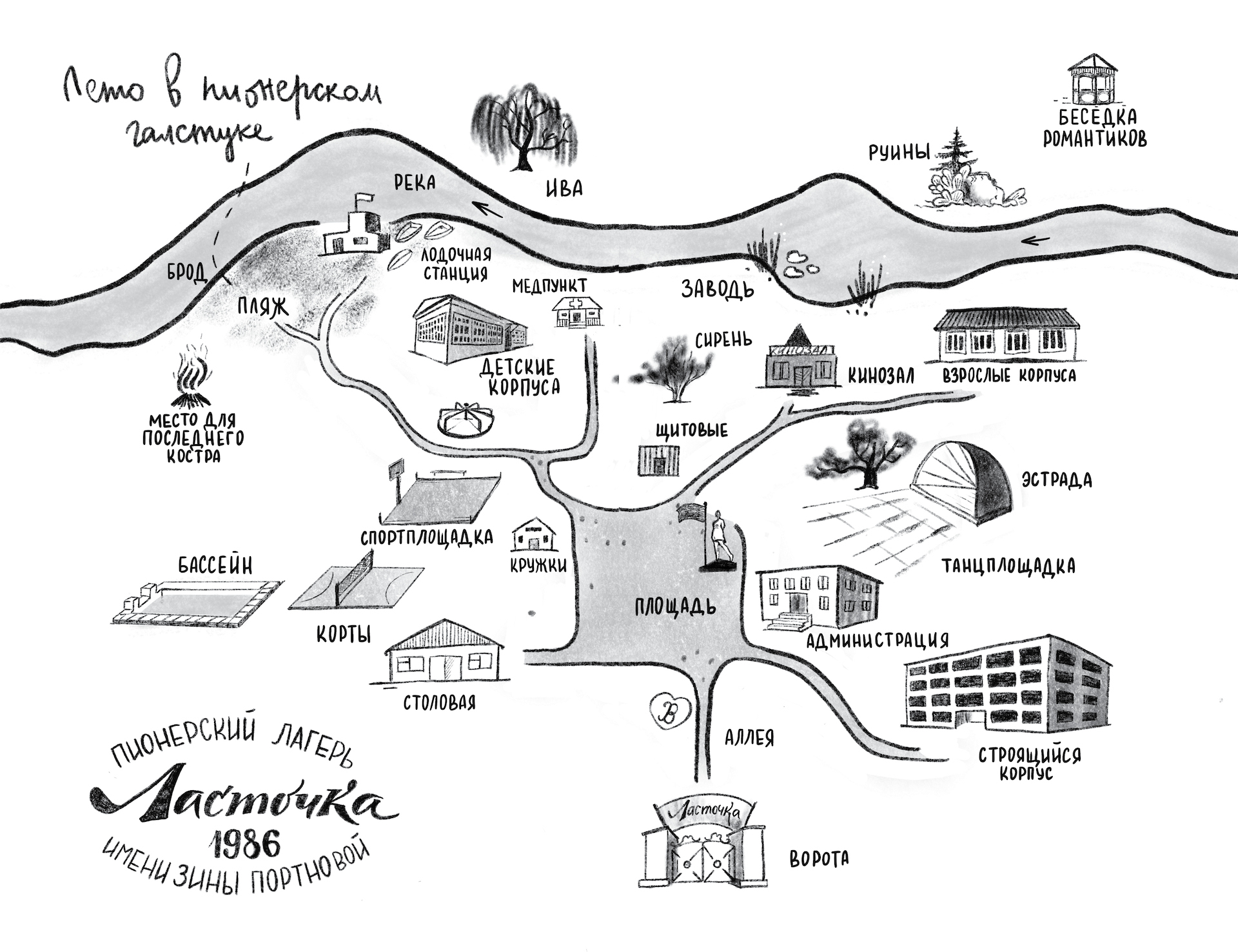 Он совершенно не помнил, как проехать в лагерь. В последний раз Юра видел «Ласточку» двадцать лет назад – и то никогда не ездил туда сам, его привозили. Как это было весело – катить в составе колонны одинаковых белых в красную полоску «ЛИАЗов» с табличками «Дети» и флажками. Особенно в авангарде, сразу за машиной ГАИ, чтобы всё – и дорога, и небо – было как на ладони. Слушать вой сирены, распевать детские песни хором или скучать, глядя в окно, потому что уже вырос из глупых куплетов. Юра помнил, как в свою последнюю смену не пел, но слушал: «У машин глаза горят, на кабинах флаги, это едет наш отряд в пионерский лагерь…» – а двадцать лет спустя слышал лишь звон прыгающей в багажнике лопаты. Ругался сквозь зубы на колеи и ямы, молился, чтобы где-нибудь не завязнуть, и смотрел не на голубое небо, а на серые тучи.