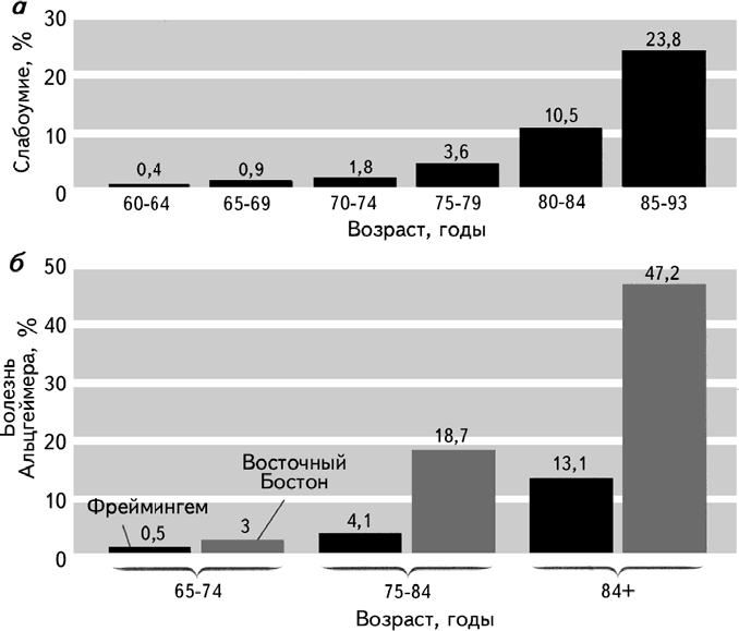 Рис. 18.1 (а, б). Распространенность слабоумия в США. В 1992 г., согласно результатам Фреймингемского исследования, в котором многократно оценивается состояние здоровья большой группы пациентов по мере их старения, преобладает слабоумие а), включая болезнь Альцгеймера б).