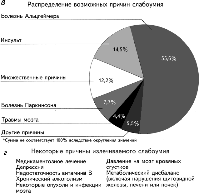 Рис. 18.1 (в, г). Данные по болезни Альцгеймера отличаются от результатов, представленных группой Восточного Бостона (возглавляемой Д. Эвансом из Медицинской школы Гарвардского университета), по-видимому, вследствие того, что Фреймингемская группа использует более широкое определение заболевания. Результаты этой группы, а также других групп, указывают на болезнь Альцгеймера как на ведущую причину слабоумия в конце жизни в). Здесь перечислены некоторые примеры излечиваемого в настоящее время слабоумия г) (Селко, 1992).