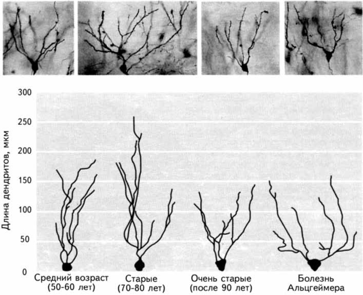 Рис. 18.3. Нейроны гиппокампа (фотографии вверху) окрашены в препаратах мозга, взятых у здоровых людей в возрасте после 50, 70 и 90 лет и у пациента с болезнью Альцгеймера (слева направо). Д. Флад и П. Колеман из Медицинского центра Рочестерского университета обнаружили, что средняя длина дендритов у таких нейронов увеличивается между средним и пожилым возрастом и уменьшается только у очень старых людей (рисунки внизу). Нормальный рост может отражать компенсацию деструктивных возрастных изменений в мозге. При болезни Альцгеймера связанный с возрастом рост дендритов не наблюдается (Селко, 1992).