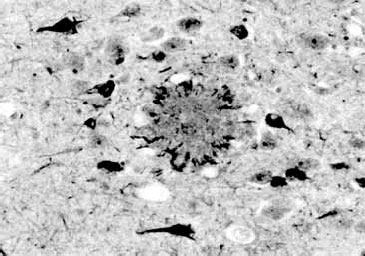 Рис. 18.4. Ткань мозга 69-летнего человека с классическими признаками болезни Альцгеймера – сенильными бляшками и нейрофибриллярными клубками. Видная на этом препарате бляшка состоит из бета-амилоидного белка и расположенных по периферии поврежденных аксонов и дендритов (темные крючковидные структуры). Клубки, которые состоят из скрученных нитей, заполняют цитоплазму некоторых клеток (темные). Бляшки и клубки появляются также в мозге здоровых стареющих людей, но их значительно меньше и их локализация ограничена (Селко, 1992).