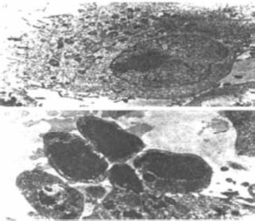 Рис. 18.5. Электронные микрофотографии контрольной клетки а) и клетки в состоянии апоптоза б). Апоптозная клетка раздроблена на отдельные кусочки, многие из которых содержат фрагменты уплотненного хроматина (на фотографии – темноокрашенное вещество) (Агол, 1996).
