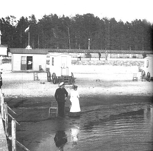 Купание в то время – это сложная, но и забавная процедура. Поскольку у берега очень мелко, купальни строились на значительном расстоянии от кромки берега, и купальщики шли туда по длинным деревянным мосткам или даже приезжали на специальных повозках. За пользование купальней (а она была нужна в первую очередь для того, чтобы, соблюдая приличие, скрывать купальщиков от посторонних глаз) приходилось платить около 3 рублей в сезон.