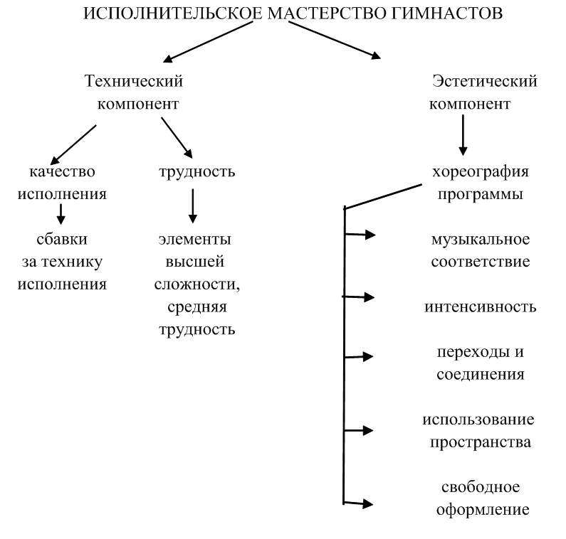 Исполнительское мастерство гимнастов, как ранее было отмечено, слагается из двух компонентов: технического и эстетического. Поэтому в основу исследования положена разработанная схема ИМГ в спортивной аэробике (рис. 10), где технический компонент выражен в трудности упражнения и качестве исполнения, а эстетический компонент – в содержании и композиционном построении упражнения (хореография программы).