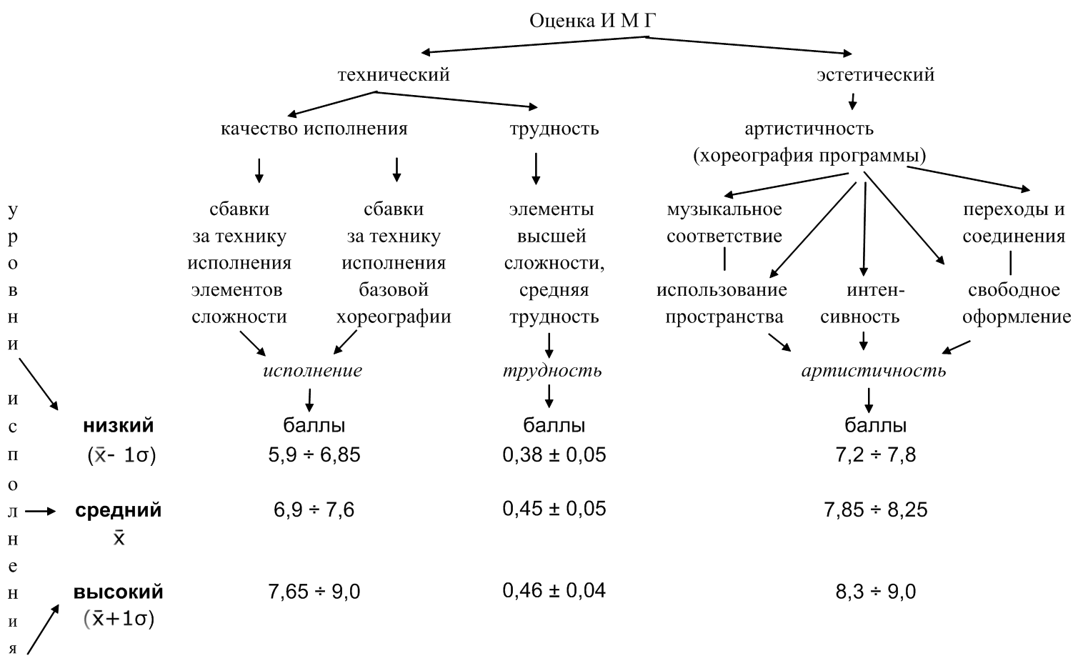 Анализ соревновательных результатов чемпионата и первенства СФО по спортивной аэробике – 2005 (n = 38) и расчет среднеарифметических и стандартных отклонений позволил определить диапазон оценок за исполнение, артистичность, трудность. На основе этого было выделено три уровня исполнения: низкий, средний и высокий. Три уровня легли в основу модели оценки исполнительского мастерства гимнастов в спортивной аэробике (рис. 11).