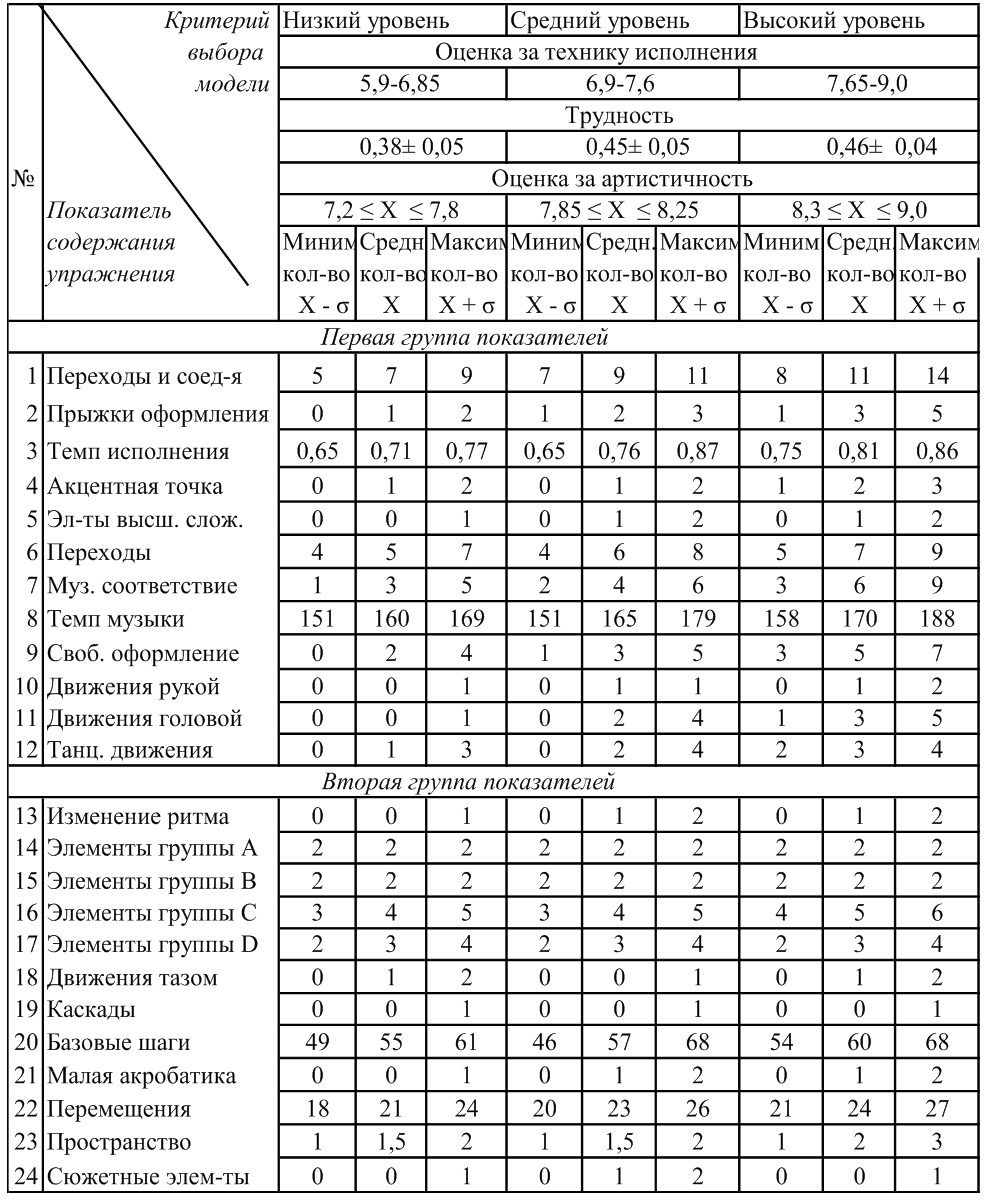 Далее были рассчитаны минимальные, средние и максимальные значения по каждому показателю программы для трех уровней ИМГ. Таким образом, была составлена модельно– диагностическая карта для оценки и коррекции соревновательных программ гимнастов старших разрядов в спортивной аэробике (табл. 3).