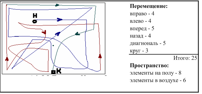 2. Оценить перемещение по площадке (количество перемещений вправо, влево, назад, вперед, по диагонали, по кругу) и зафиксировать с помощью зарисовки.