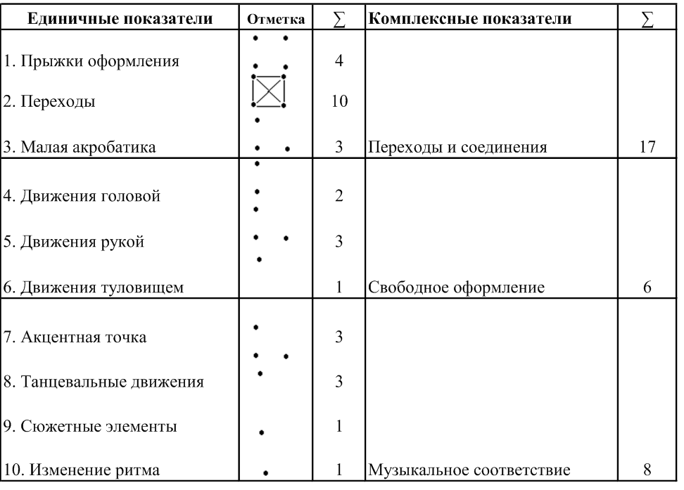Многочисленные педагогические наблюдения и анализ методической литературы, правил соревнований по спортивным видам гимнастики позволили определить составляющие соревновательного упражнения и показатели композиционного рисунка. Это различные элементы, движения, действия, акцентные точки, перемещения, направления и прочее (24 показателя – см. табл. 1). В результате статистико-математической обработки эти составляющие упражнения были разделены на две группы: первая группа – показатели выразительности и вторая группа – остальные показатели содержания и композиционного рисунка упражнения. В первую группу вошли показатели, которые имеют достоверное влияние на оценку за артистичность (от 13 до 38 %). Поэтому эти показатели формируют группу средств выразительности (приложение 2).