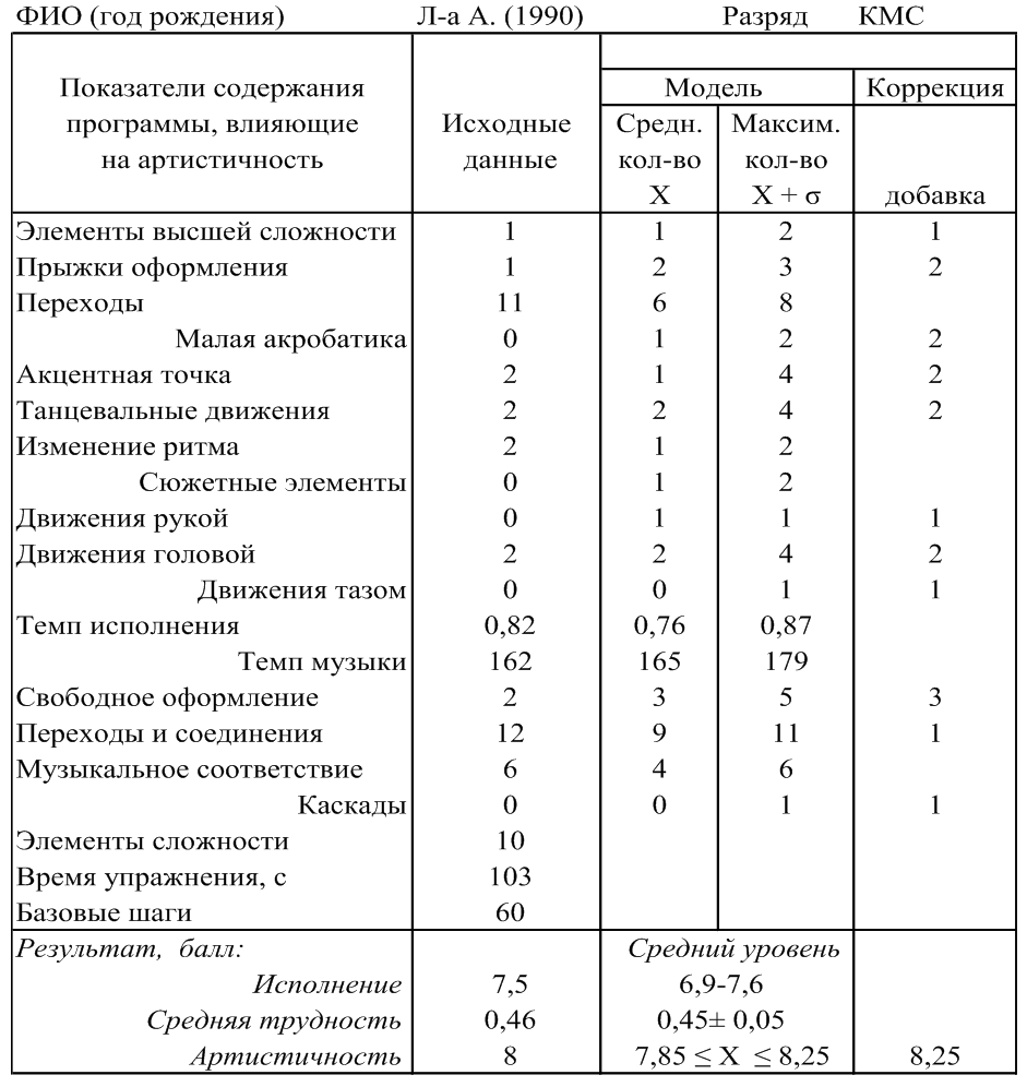 При соблюдении модельных характеристик содержания индивидуальных соревновательных программ можно заранее спрогнозировать соревновательную оценку за артистичность.