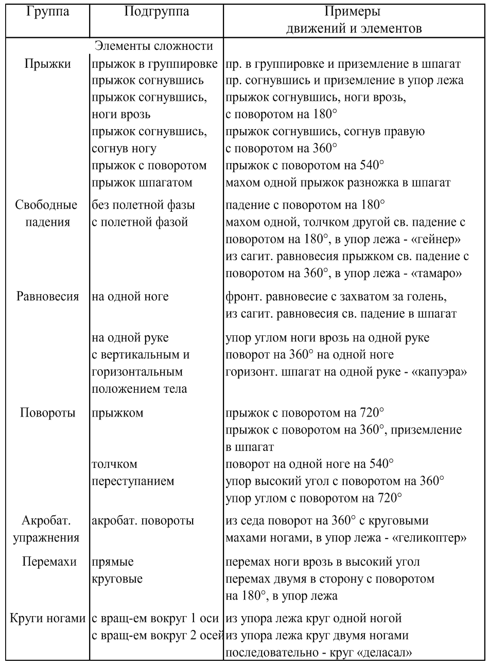 Опираясь на это, выделим следующие группы движений, которые составляют основу содержания соревновательных программ: