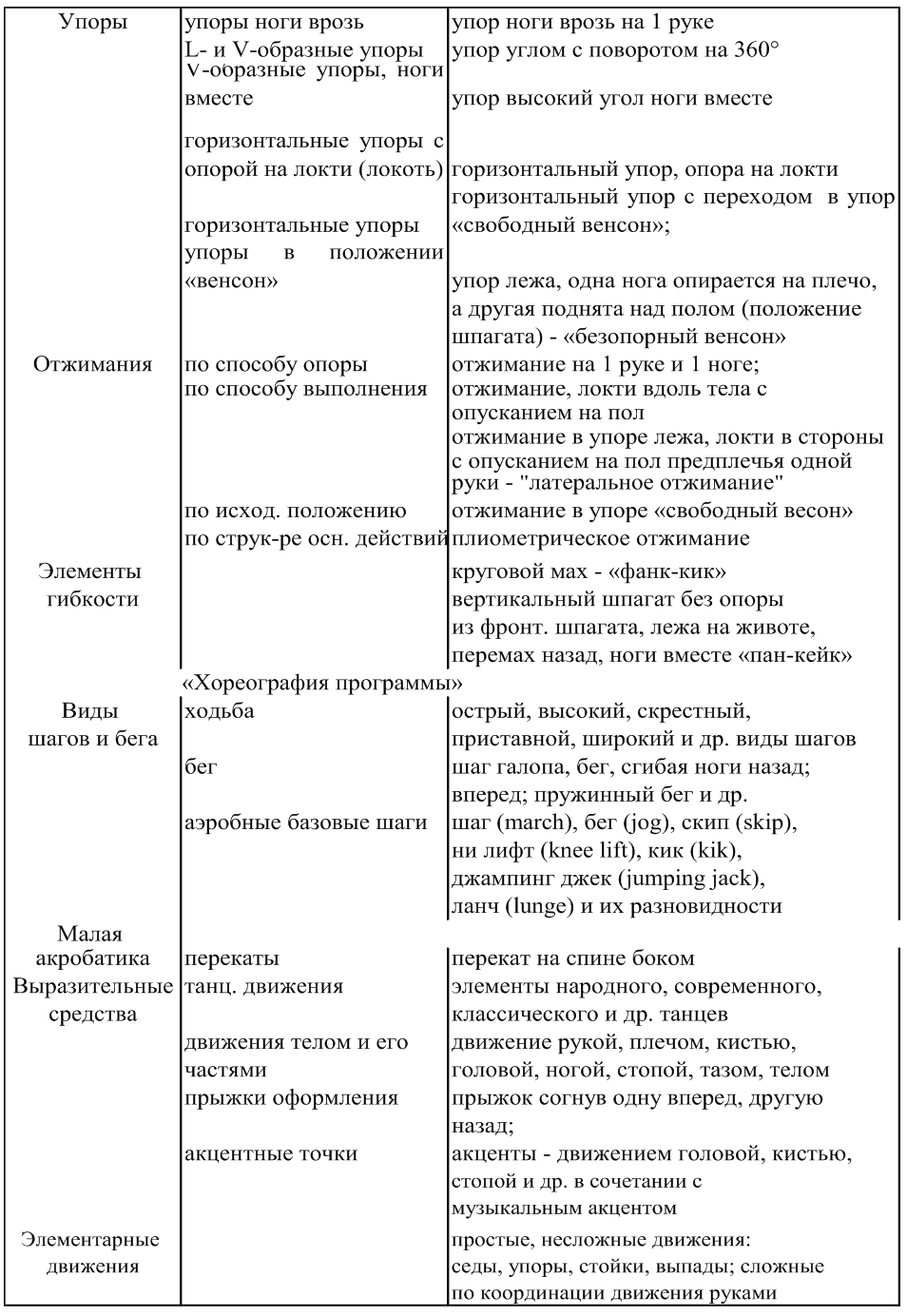 Для более эффективного использования карты нами был разработан перечень элементов, движений и действий, который тренер может использовать при работе над соревновательными упражнениями. Этот перечень не является исчерпывающим, а служит попыткой систематизировать все движения и действия соревновательного упражнения солистов в спортивной аэробике и может помочь начинающим специалистам в реализации своих педагогических творческих способностей.