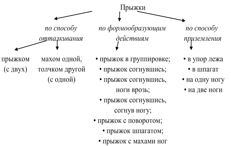 Основной классификацией прыжков является классификация по признаку формообразующих действий. В этом случае эта группа состоит из семи подгрупп: прыжок в группировке; прыжок согнувшись; прыжок согнувшись, ноги врозь; прыжок согнувшись, согнув одну; прыжок с поворотом; прыжок шпагатом; прыжок с махами ног.