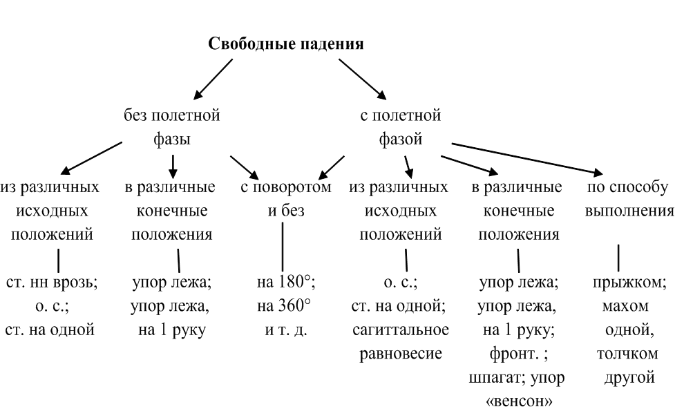 Свободные падения выполняются из различных стоек (основная стойка, стойка ноги врозь) и равновесий; прыжком; с поворотом и без; с приземлением в упор лежа (на две, на одну руку), в шпагат и др. (рис. 13).
