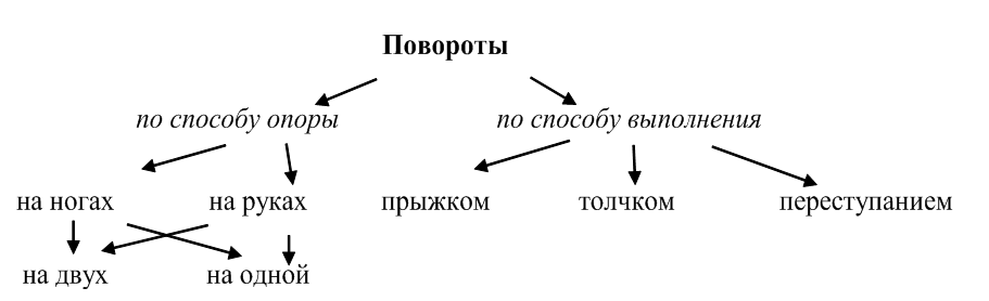 Повороты – важнейшая составная часть техники прыжков, равновесий, упоров, падений и др. В данную группу объединены повороты, выполняемые на ногах (свободное падение с поворотом на 360°; поворот на одной ноге на 720°) и на руках (упор высокий угол с поворотом на 360°, упор углом ноги врозь с поворотом на 720° и т. д.). Упоры углом с поворотом, как правило, выполняются переступанием на руках, а повороты на ногах выполняются либо прыжком, либо толчком (рис. 15).