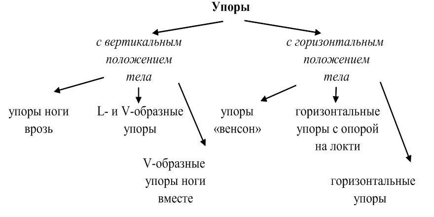 Другая разновидность V-образных упоров представляет собой упор высокий угол, ноги вместе, при котором необходимо удерживать туловище и ноги в положении согнувшись («полная складка») перпендикулярно полу. Более сложный вариант упоров, требующий высокого уровня физической подготовленности, – горизонтальный упор. К наиболее простому варианту упоров, если имеется хороший уровень подвижности в тазобедренных суставах, относится упор «венсон». Данный элемент можно охарактеризовать как положение в упоре лежа, шпагатом правой (левой) с опорой о плечо.