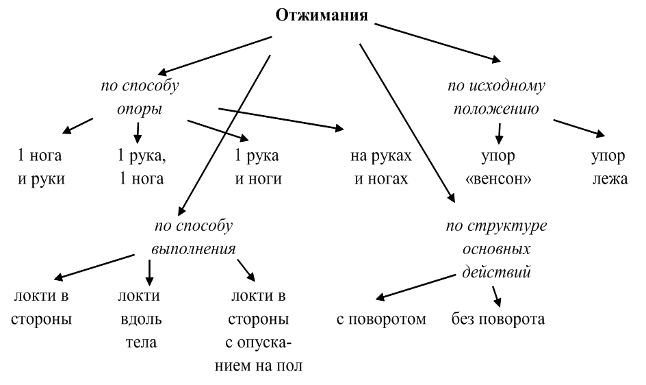 Практически все элементы стоимостью 0,1–0,2 балла можно классифицировать по одному признаку. Например, отжимание в упоре лежа (0,1 балл) – направление локтей в сторону; отжимание в упоре лежа локти вдоль туловища с опусканием на предплечья (0,2 балла) или латеральное отжимание в упоре лежа (0,2 балла) – направление локтей в стороны с опусканием на пол предплечья одной руки. В основе этих отжиманий лежит один признак – способ выполнения. Однако некоторые элементы стоимостью более 0,2 балла разбираются по нескольким признакам. Например, латеральное отжимание в упоре лежа на одной руке и одной ноге (0,5 балла) – по способу опоры и способу выполнения.