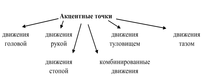 Наши результаты исследования показали, что очень эффективны акцентные точки. Однако эта точка должна обязательно совпадать с музыкальным акцентом, иначе утрачивается вся эффектность и зрелищность. Акцентные точки, как правило, выполняются одной либо несколькими звеньями тела (рис. 22).