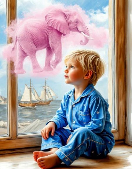 Вечером он вырезал из цветной бумаги фигурки и склеил аппликацию, на которой розовый слонёнок жевал банан под раскидистой пальмой. Мальчуган смотрел на свою поделку, крутил глобус и размышлял о том, как было бы здорово дружить со слоном. Живое детское воображение рисовало путешествие по джунглям. Мальчик взглянул в окно. Заходящее солнце преобразило мир. Лёвка взобрался на подоконник и, мечтая, стал рассматривать облака в небе. Жаркий закат окрасил их паруса сочной акварелью, волшебными ладьями уплывали они в дальние страны. Где-то на горизонте корабли приставали к неизвестным берегам и превращались в пальмы и лианы, в весёлых мартышек и разноцветных попугаев. И вдруг из радужного леса вышел розовый слон. Он покачал головой и высоко поднял хобот, приветствуя путешественника, а большие уши-опахала затрепетали. Мальчишка призывно махнул рукой. Слоник шагнул в фиолетовые волны небесного моря и двинулся навстречу. Лёвка ждал с замиранием сердца. А когда розовый хобот коснулся его груди, он прижался к слонёнку и прошептал: