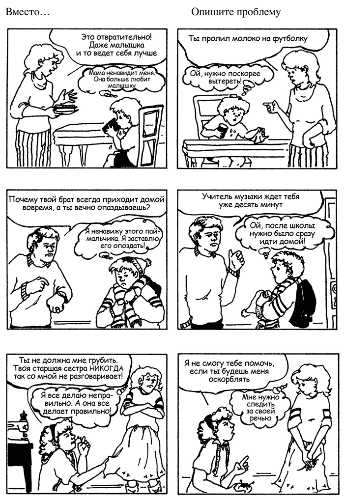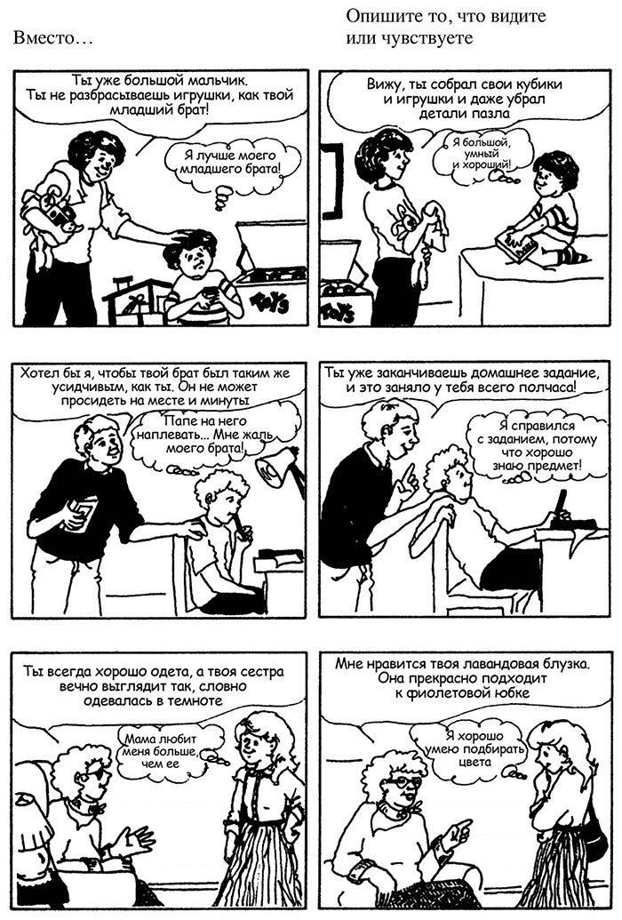 – Однако мне удалось преодолеть этот вредный шаблон, – продолжала я. – Каждый раз, когда мне хотелось сравнить детей между собой, я говорила себе: «ОСТАНОВИСЬ! НЕ ДЕЛАЙ ЭТОГО! То, что ты хочешь сообщить этому ребенку, можно сказать прямо, не упоминая его брата. Ключевое слово – описание. Опиши то, что видишь, или то, чего тебе хотелось бы. Опиши то, что тебе не нравится, или то, что нужно сделать. Самое главное – говори только о поведении этого конкретного ребенка. То, что сделал или не сделал его брат, не имеет к нему никакого отношения».