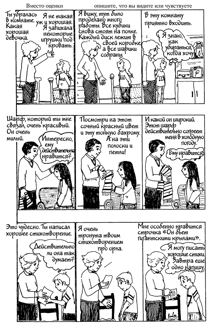 Пожалуйста, позвольте себе первоначальную реакцию. Если вы искренне испытываете восторг и ловите себя на том, что говорите «Великолепно!», ребенок услышит энтузиазм в вашем голосе и воспримет это как выражение ваших чувств. Однако вы всегда можете расширить вашу первоначальную реакцию описанием, которое поможет ребенку узнать о степени вашего одобрения: «Вот как это было. Устав за день работы, я пришла домой и обнаружила, что весь двор подчищен граблями, мешки с листьями завязаны и стоят у фасада. Я получила такой подарок!»