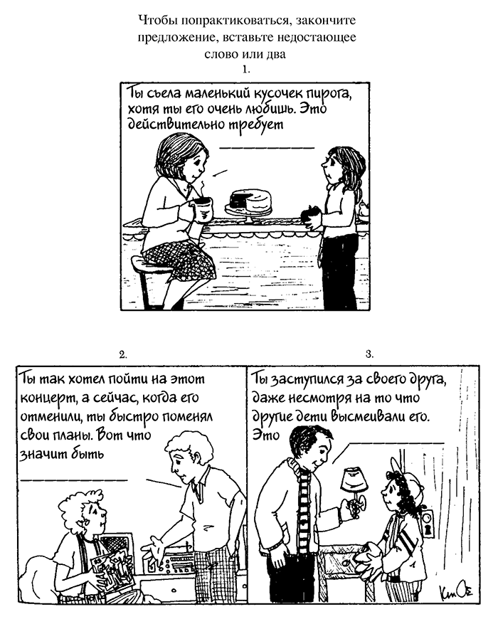 В следующем упражнении у вас будет шанс применить на практике описательную похвалу. Читая каждую ситуацию, уделите время тому, чтобы представить мысленно, что именно сделал ваш ребенок. Затем в деталях опишите, что вы видите или ощущаете.