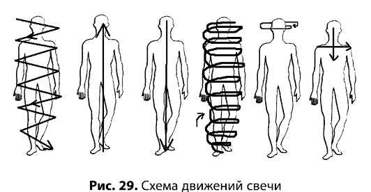 Возьмите восковую церковную свечу, зажгите ее и встаньте рядом. Начните читать псалом 90 (можно прочесть его один раз, а лучше три), одновременно совершая перед собой зигзагообразные движения свечой сверху вниз, до ног. Потом поднимите свечу вверх, до макушки, затем снова опустите вниз и далее поднимайте по спирали против часовой стрелки. Когда дойдете до головы, оберните свечу вокруг головы против часовой стрелки три раза, затем перекрестите один раз напротив горла и оставьте свечу догорать (рис. 29).