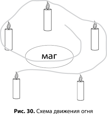 Закройте глаза и войдите в Альфа-состояние. Почувствуйте, как вокруг вас горят свечи, ощутите их очищающее пламя. Представьте, как огонь от свечей начинает передаваться от одной свечи к другой, соединяя их вместе и обвивая вас огненной спиралью (рис. 30). Эта спираль движется снизу вверх против часовой стрелки, окутывая ваше тело с головой чем-то похожим на огненный кокон. Наблюдайте, как этот кокон создается вокруг вас, ощутите себя в нем. Он чистит вашу энергетику, убирает негативные привязки.