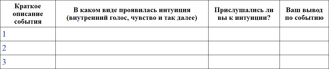 Это упражнение проводится не в какое-то определенное время, а от случая к случаю. Когда у вас появятся ситуации, где вы сможете прислушаться к интуиции, запишите их в данную ниже аналитическую таблицу. Когда таких случаев у вас наберется больше шести, проанализируйте, что вам помешало или помогло воспользоваться интуицией, как и в каком виде она у вас проявилась. Подобные записи укрепят вашу веру в шестое чувство, доверие к нему увеличится, и, следовательно, его сила возрастет.