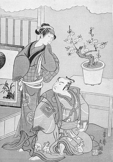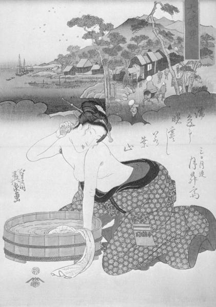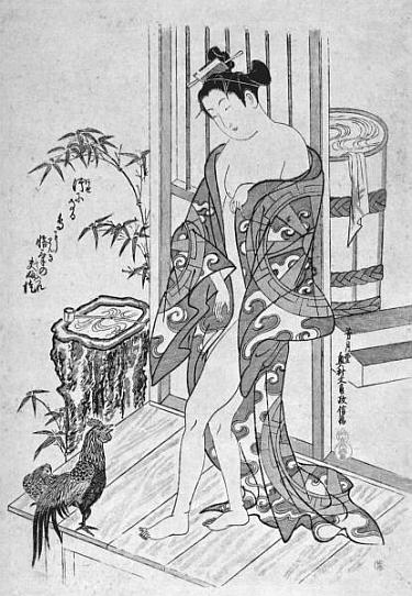 На многих классических гравюрах японской любви, женщина изображается практически всегда одетой в кимоно, пусть короткое, прозрачное или распахнутое. Именно эта условная защищенность одеждой действовала возбуждающе на мужчин. Японские гейши, пользуясь этим знанием психологии, могли не вступая в акты любви довести мужчину до высшего блаженства. Танцуя, они приподнимали полы кимоно, демонстрируя свои половые органы. Во многом эти танцы были похожи на религиозный обряд у японцев, связанный с мифом: однажды богиня Солнца обиделась на людей и покинула небо. Мир погрузился в тьму. Как ни уговаривали ее боги вернуться, она отказывалась. Тогда одна из богинь встала перед пещерой и начала обнажаться, показывая свое лоно. Богиня Солнца, сжигаемая любопытством, вышла. Так в мир вернулся свет.