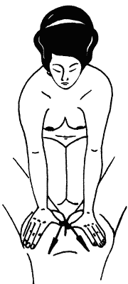 Прием 7. Данный прием предназначен для дополнения двух предыдущих. Положите ладони обеих рук на лопатки, пальцы направлены вниз, к крестцу. Сохраняя спину прямой, выполните медленное и равномерное надавливание. Не быстро, но с усилием. Применяя технику разминания, двигайте руки по обе стороны от позвоночника в направлении к крестцу. Затем возвращайтесь вверх, надавливая только большими пальцами непосредственно на сам позвоночник.