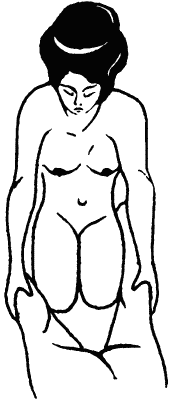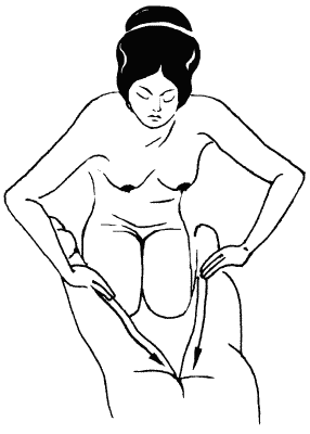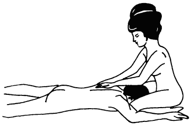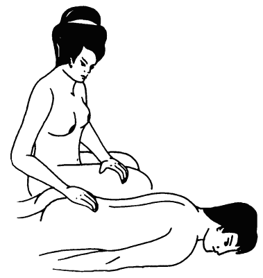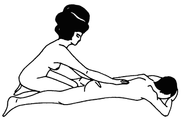 Надавите пальцами в направлении задней стороны бедер. Затем разделите руки и проведите по бокам тела вверх, к подмышкам. Проведите руками по плечам и снова соедините в начальном положении. Начинайте движение с легкого давления так, будто ваши руки – это крылья легкой бабочки. Затем от цикла к циклу усиливайте давление; достаточно сильно, но в то же время приятно для партнера. В районе ануса и промежности обязательно уменьшайте давление. Сделав несколько таких циклов, постепенно начинайте уменьшать давление и заканчивайте прием очень легким, таким, каким вы начинали массаж.