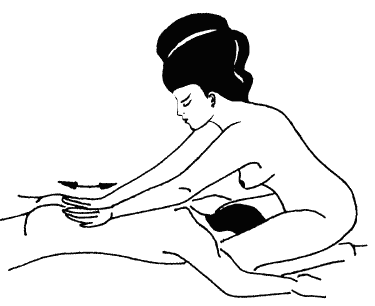 Медленно протяните руку к себе, то есть к ребрам на правой стороне туловища вашего партнера. Проделайте то же самое движение правой рукой и так, попеременно меняя руки, продолжайте данный массажный прием или растирания поперек тела. Степень нажатия или давления не должна быть ни сильной, ни слабой.