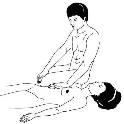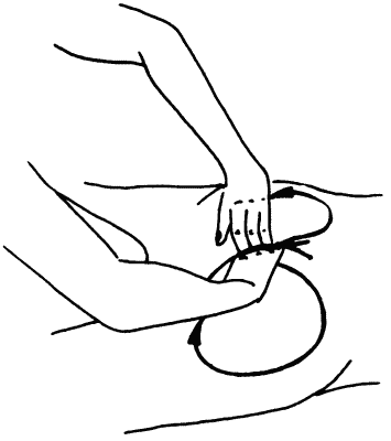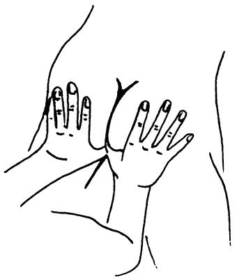 Прием 3. Этот прием – скорее возможность расслабиться, чем массажное движение. Оставаясь в таком же положении, как и раньше, положите левую ладонь на солнечное сплетение партнера. Дайте ему ощутить тепло вашей руки. Слегка надавливая, но не сдвигая с места, направляйте руку в сторону от лобка. Еще раз повторяю – это хороший прием для расслабления вашего партнера.
