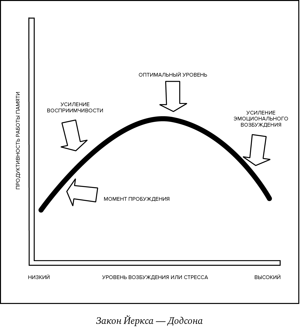 – Повторим еще раз главное, – сказала я, указывая на правую часть кривой, – высокие уровни возбуждения или стресса резко понижают нашу способность обрабатывать информацию и хранить ее в памяти. Многие люди ошибочно полагают, что мощный стресс усиливает память, и это ошибочное представление как раз и зафиксировано в заявлении: «О боже, я так испугалась, что никогда не забуду это лицо!» На самом деле сильный стресс может лишь ослабить память.