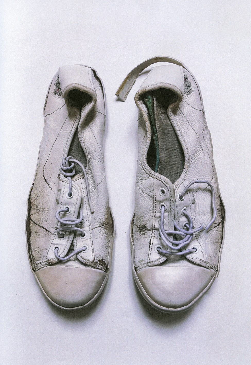 Глядя вниз на собственные ноги, я чувствую прилив стыда за свои потрепанные кожаные кроссовки (думаю, исследователь обуви должен быть обут получше). Эта обувь – обувь на грани; почти – но не полностью – развалившаяся. Я много раз их чинила: покупала новые шнурки, стирала и отбеливала пятна, полировала кожу и тщательно закрашивала потертости, – и все же они явно и заметно изношены. Подошва из вулканизированной резины оторвалась от кожи и со стороны пятки загибается вверх к лодыжке, средняя часть покрыта неразглаживаемыми складками из‐за того, что я постоянно раскачиваю стопу, пока пишу. С левой стороны подошва почти стерлась, открывая беспорядок композитных слоев внутри. «Залюбленные», – кто-то скажет по-доброму, но правда в том, что им пришел конец: они стоптаны, порваны и стары. Эти неприметные и нейтральные кроссовки путешествовали со мной в течение многих лет через материки, ходили на работу и в архивы, на собеседования и экзамены. Кроссовки, которые благодаря ежедневному ношению так точно повторяют форму моих ног, почти истлели.