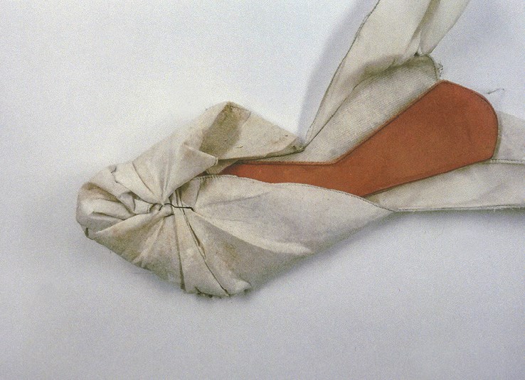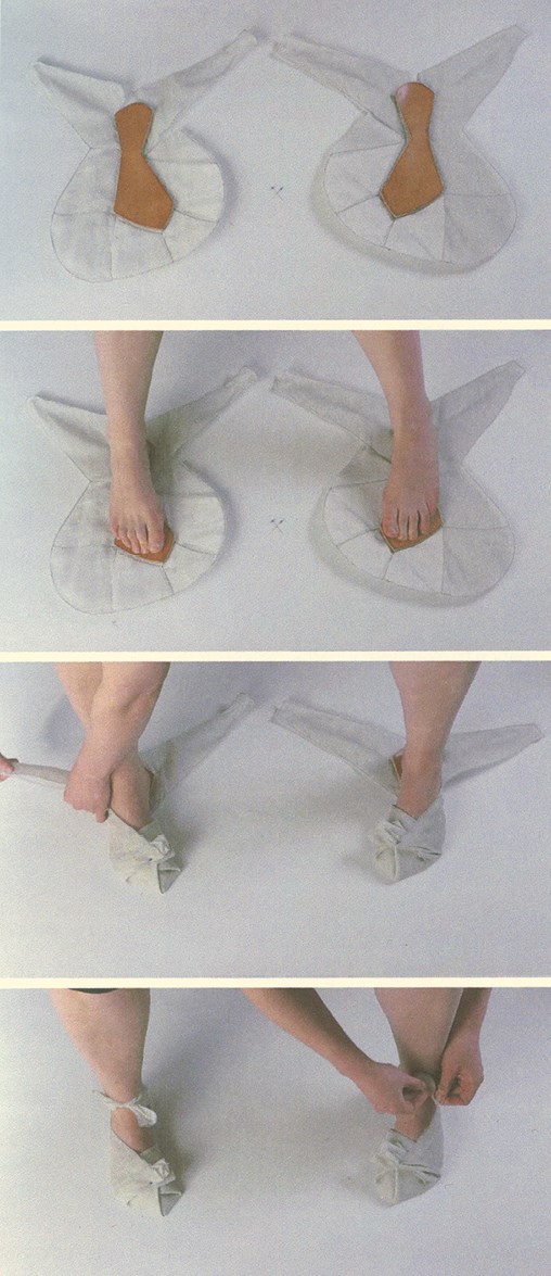 Сделанные мной туфли ломались легче, чем «нормальные» туфли, и были открытыми, так что отпечатки тела были легко видны. Обувь делала следы воплощенных и телесных отношений между носящим и носимым более очевидными для зрителя и, таким образом, сместила акцент с обуви как товара на обувь как хронику. Чтобы этого добиться, я абстрагировала туфлю, разобрала на части и упростила ее конструкцию. Я подчеркивала определенные качества, такие как способность стельки хранить отпечаток ноги владельца, мягкость окутывающей стопу комнатной тапочки, прочность и гулкий резонанс деревянных подошв. Я сделала обувь, внутренности которой открыты взгляду, и всем своим видом она требует, чтобы зритель вступил во взаимодействие с интимной материальностью износа. Делая обувь более абстрактной, я опиралась на две традиции изготовления обуви: мягкую и жесткую. Мягкая обувь была изготовлена из кусочков текстильного материала: выкроена, сложена и завязана, чтобы обхватить стопу. Такая обувь быстро разрушалась, принимая форму стопы по мере того, как она растягивалась и изнашивалась. Их простая складчатая конструкция позволяет после ношения разворачивать их и укладывать плашмя, открывая взгляду следы использования. В конце концов самые мягкие туфли, сделанные из шелка и кожи, полностью сносились, распались на части под тяжестью моего тела. Одновременно я сделала сабо и паттены, или твердые деревянные и металлические защитные ботинки, которые носят поверх обычной обуви. Они скалывались, царапались и гнулись, а не растягивались или изнашивались. Жесткие ботинки вступали в противодействие с моим телом, отдавались вибрациями в коленях и натирали пальцы ног. При создании этих абстрактных туфель в своем исследовании я опиралась на концепцию «остранения» Виктора Шкловского (Шкловский 2016), то есть делала обувь и ее ношение (как повседневную практику) чуждыми, незнакомыми. Обувь остранялась как через абстрактность формы – она не «считывалась» как повседневная обувь, так и через помещение ее, повседневного и потенциально отвратительного артефакта, в пространство художественной галереи.
