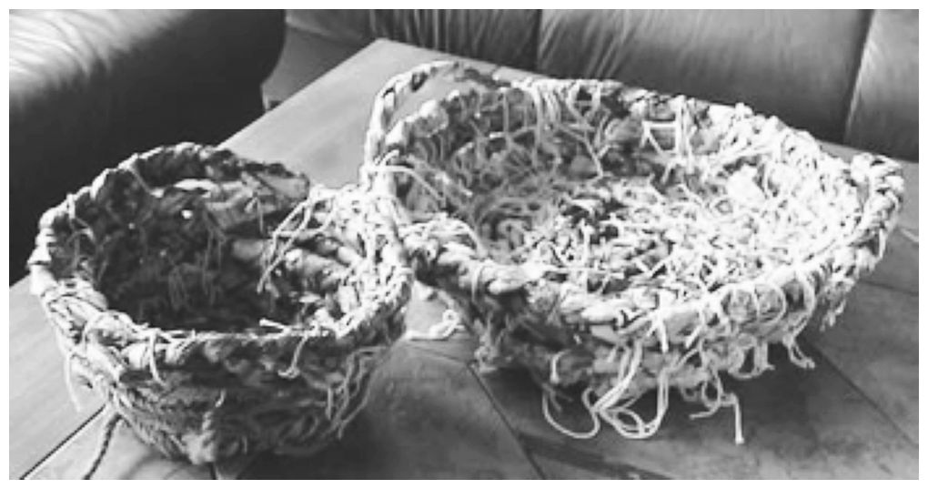 В ходе этой серии занятий я заинтересовалась вторичными материалами, которые я находила около дома, и начала делать плетеные корзины из ярко раскрашенных рекламных разделов газет.