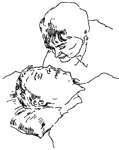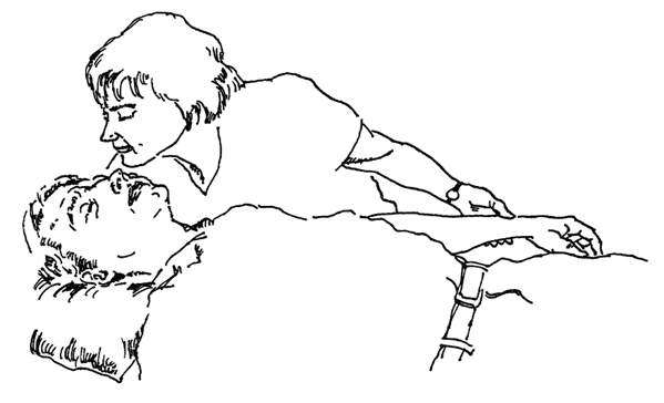 3. Наклоняйте голову к человеку и сопровождайте /стимулируйте его дыхание звуками. Медленно придвиньтесь ближе. Поместите свою голову вблизи уха коматозного человека (рис. 1). Издавайте мягкие звуки выдоха и вдоха, отражающие темп и силу его дыхания.