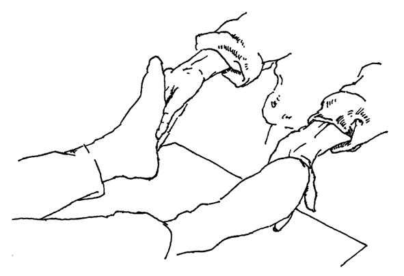 Затем Джон мягко нажимает на основания больших пальцев ступней, слегка сгибая ступни, когда коматозный человек вдыхает, и прекращая нажим на выдохе. Одновременно вы продолжаете работать с запястьем (рис. 3). Следите за обратной связью. Если вы получаете реакцию, продолжайте.