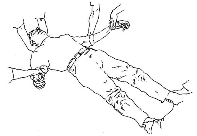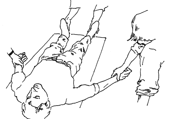На еще одном этапе вы можете добавить третьего человека, чтобы он делал то же самое с другим запястьем в такт с дыханием (рис. 4). Как вариант – два человека, по одному с каждой стороны постели, могут слегка приподнимать каждые локоть и запястье, когда человек вдыхает, и осторожно опускать их на выдохе. Человек, стоящий в ногах, теперь может поддерживать и медленно поднимать ноги в лодыжках в том же ритме и затем снова давать им опускаться.