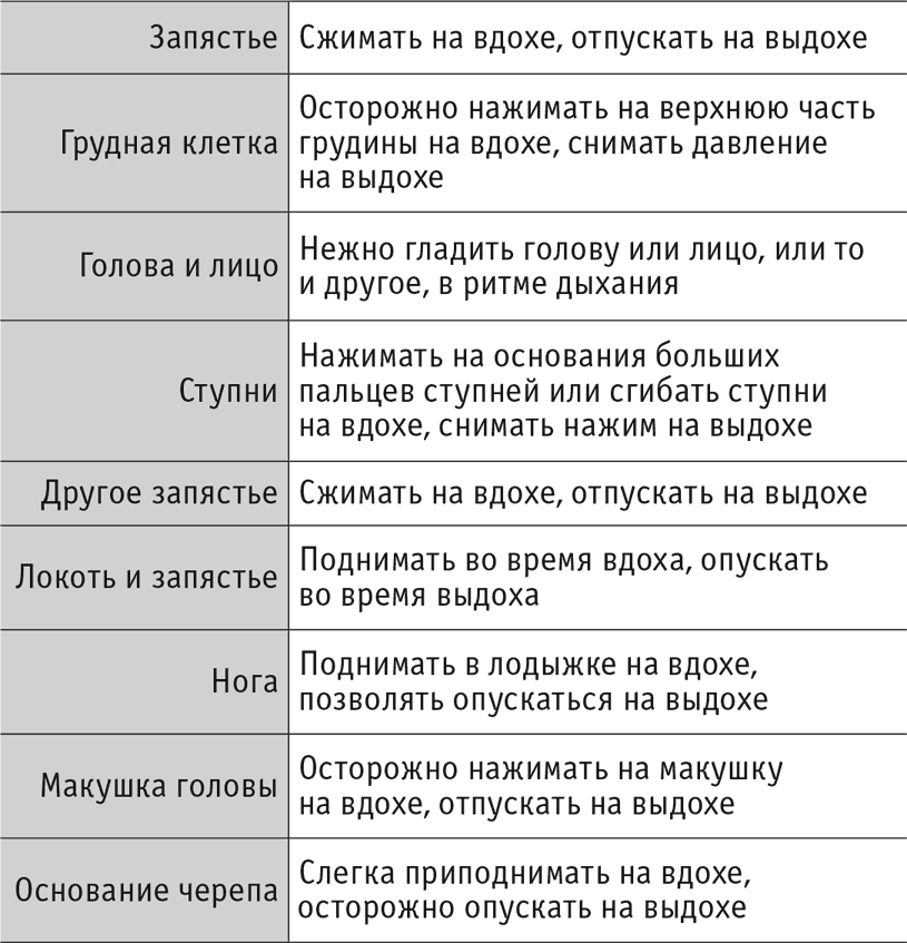 Замечайте реакции на коммуникацию – например, более глубокие вздохи. Если вы получаете такую положительную обратную связь на сжатие запястья, продолжайте это делать немного дольше.