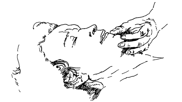 Кто-нибудь также может стоять позади головы коматозного человека и, если у последнего там нет никаких осложнений или повреждений, осторожно нажимать ладонями на темя при вдохе и прекращать давление на выдохе.
