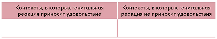 Вернитесь к рабочим таблицам из главы 3 и еще раз повторите, какие контексты позволяют вашему мозгу интерпретировать генитальную реакцию как приносящую удовольствие.
