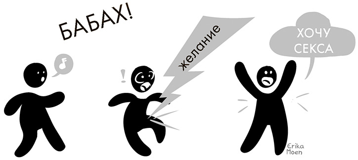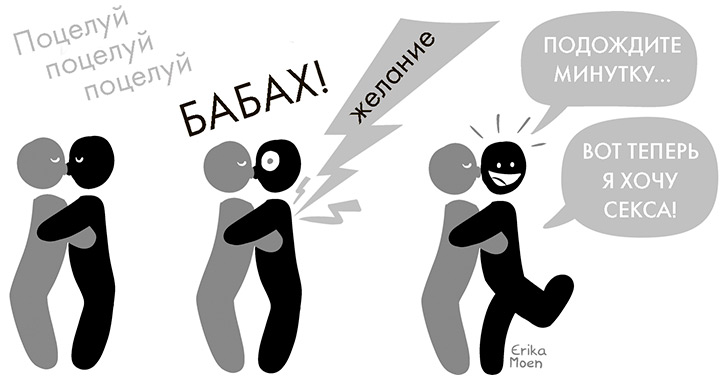 У многих из нас сложился совсем другой стереотип – спонтанное желание. Эрика Моэн, карикатуристка, иллюстрировавшая книгу «Как хочет женщина…», изображает спонтанное желание как удар молнии в гениталии – бабах! Оно возникает нежданно-негаданно и предвосхищает удовольствие.