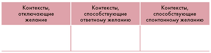 Это упражнение вам уже знакомо. В упражнениях «Изучите контекст» и «Оцените контекст» главы 3 – вы рассмотрели, как контекст формирует ощущение удовольствия. Здесь вы изучите, как он формирует ощущение желания. В упражнении 2 главы 2 «Что “включает включатели” и что “выключает выключатели”?» вы отметили факторы, от которых у вас пропадает всякое желание, и факторы, которые гарантированно вас заводят – независимо от остальных условий контекста.