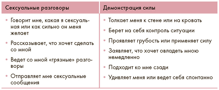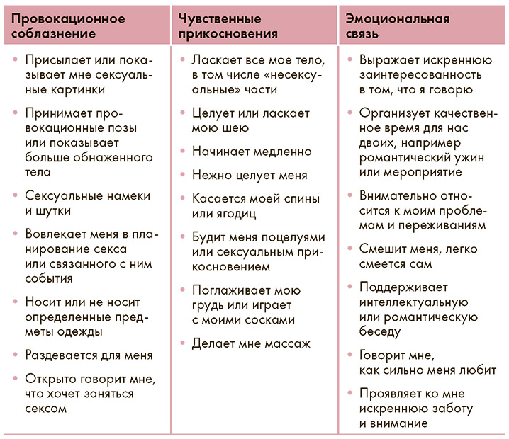 Выше и ниже вы найдете широкий выбор способов предложить секс (как вы хотели бы, чтобы ваш партнер инициировал секс с вами), разработанных на основе исследований Петры Зеброфф (Sexual Initiation Scale of Arousal). Они должны помочь вам оценить собственный стиль и стиль вашего партнера. Вычеркните непривлекательные для вас способы. Обведите те, которые, вероятно, могут сработать в правильном контексте. Отметьте звездочкой приглашающие действия, привлекательные для вас практически в любом контексте.