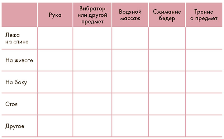 Обратите внимание, какие чувства у вас вызвала попытка систематически анализировать свою технику мастурбации. Есть ли разница между этим упражнением и предыдущими? Может быть, в глубине души вы сомневались, стоит ли делать пометки на этой странице – а вдруг кто-нибудь их увидит? Что тогда произойдет?