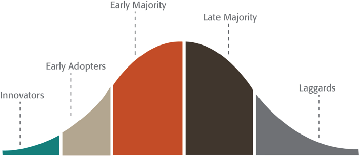 ● Позднее большинство (34 % населения). Эта категория людей равнодушна к технологии как к явлению, однако интересуется новыми возможностями ее использования.