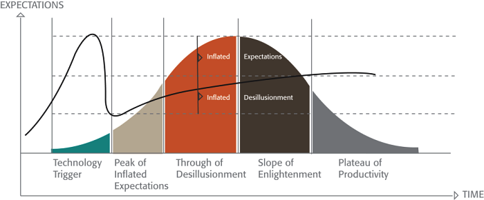 Hype Cycle (Цикл зрелости технологий)Каждый год аналитическая компания Gartner Group публикует свой Hype Cycle, или Цикл зрелости технологий. Этот график показывает также ожидания, которые связаны с каждой из технологий в отдельности.